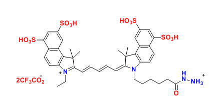 各種花青5.5(Cy5.5)染料已用于標記生物分子,用于熒光成像和其他基于熒光的生化分析。 它們廣泛用于標記肽,蛋白質和寡核苷酸等。Cy5.5染料是最常見的紅色熒光團中的一種。 Cy5.5酰肼與羰基反應。